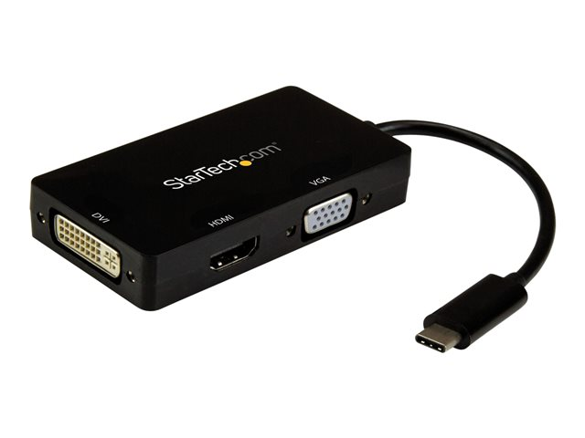 StarTech.com USB-C-videoadapter med flera portar - 3-i-1 - 4K 30Hz - svart - Videokort - USB-C hane till HD-15 (VGA), DVI-I, HDMI hona - 15 cm - svart - aktiv omvandlare, 4K 30 Hz (3840 x 2160) stöd (HDMI), 1920 x 1200 (WUXGA) stöd 60 Hz (DVI och VGA)