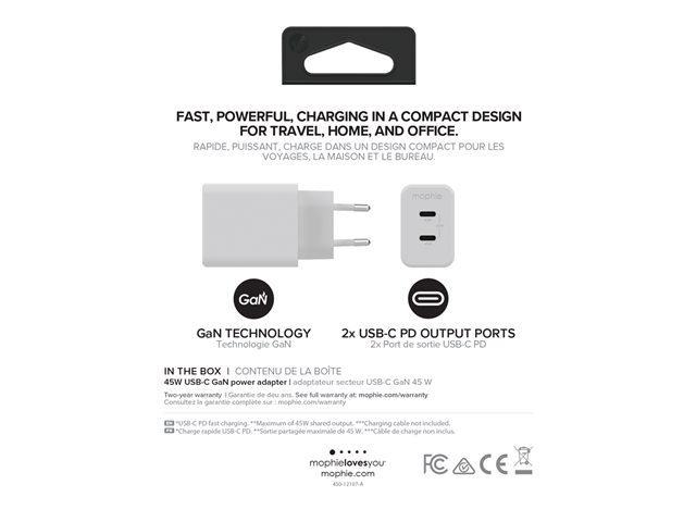 mophie speedport 45 - Strömadapter - 45 Watt - Fast Charge, PD - 2 utdatakontakter (24 pin USB-C) - vit - Europa 409909299