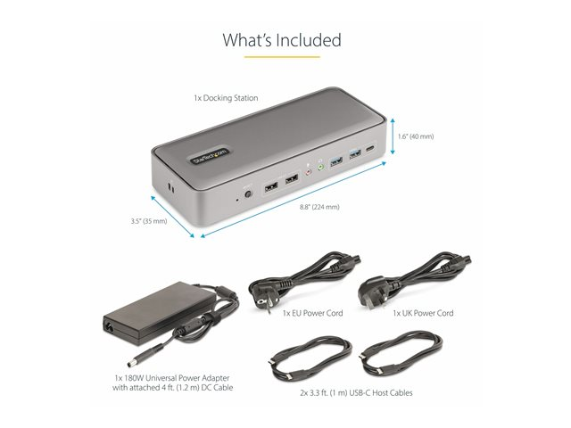 • ANSLUTNING: Dockan har en mängd olika portar för enhetsanslutning; 2x USB 2.0 Typ-A HID/2x USB-A (10Gbps)/USB-C (10Gbps)/2x DisplayPort/2x USB-C/Gigabit Ethernet/audio 3,5mm stereo/micro 3,5mm värdportar/2x K-Slots (Standard/Nano)